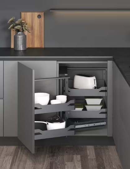 Chytré a elegantní řešení pro jinak těžko využitelný rohový prostor v kuchyni představuje výsuvný systém do slepého rohu od značky WIRELI, z řady Style. Tento moderní systém umožňuje pohodlný přístup ke všem uloženým věcem díky mechanismu, který po otevření dvířek vysune ven úložné koše z rohové skříňky.Spolu s otevřením dvířek se automaticky vysunou dva přední koše, zatímco další dva vnitřní se přesunou do snadno přístupného prostoru v přední části skříňky. Tento systém tak zajišťuje přehledné a pohodlně dostupné uspořádání potravin, nádobí nebo jiných kuchyňských potřeb. Díky chytrému rozvržení už žádný roh nezůstane nevyužitý.